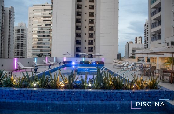 A área da piscina do empreendimento foi projetada para oferecer um refúgio de conforto e sofisticação em meio à cidade. Com iluminação noturna envolvente, paisagismo elegante e espreguiçadeiras para relaxar, o espaço é ideal tanto para um mergulho revigorante quanto para momentos de descanso ao ar livre.